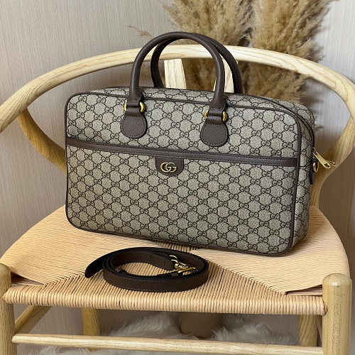 المادة والتصميم: الحقيبة مصنوعة من قماش "جي جي سوبريم" (GG Supreme) المميز والمغطى باللون البيج/البني، مع حواف من الجلد البني. يبرز شعار "دبل جي" (GG) المتشابك باللون الذهبي على الجهة الأمامية.